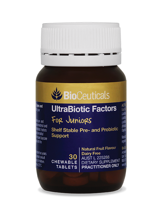 UltraBiotic Factors for Juniors contains a potent blend of pre- and probiotics to help maintain healthy gastrointestinal and immune function in children.The ingredients may provide symptomatic relief from mild eczema/atopic dermatitis and may reduce the number of days missed from school/daycare due to the common cold.